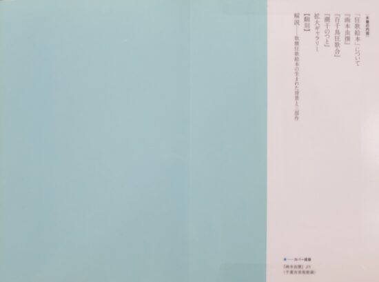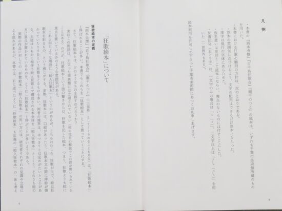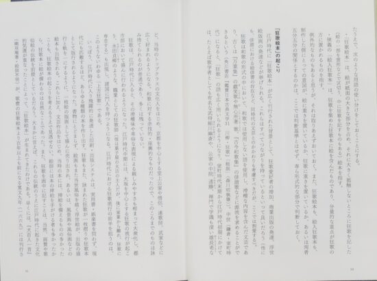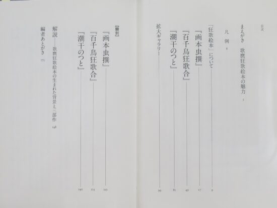 ・これは大変、有り難い図録である。浮世絵学に不可欠な、狂歌本の表紙(元装幀、元題簽)、見開き(欠落もあるか)、図版、跋(欠落もある)、翻刻などもキチンと整理されている。